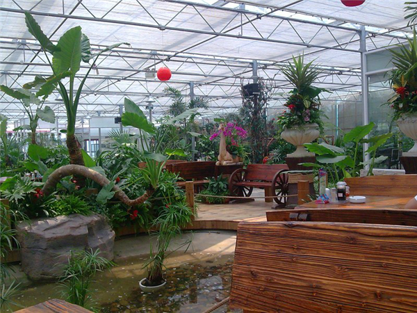 綠色生態餐廳完全按照標準溫室的結構建造,多采用文洛式,覆蓋材料多為PC板或者玻璃,結構保溫性能好,整齊規范,室內各個空間溫度均勻,有利于景觀植物的生長,鑒于餐飲布局的需要,在文洛溫室結構的基礎上,可進行局部調整。該溫室建造成本相對較低,溫室升降溫能耗低,節約后期運行費用。