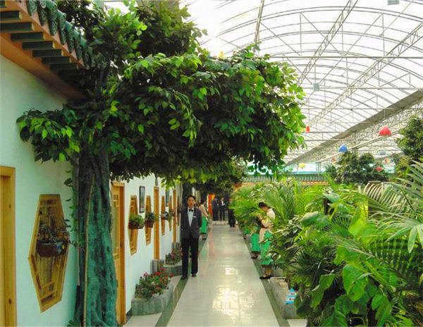 綠色生態(tài)餐廳完全按照標(biāo)準(zhǔn)溫室的結(jié)構(gòu)建造,多采用文洛式,覆蓋材料多為PC板或者玻璃,結(jié)構(gòu)保溫性能好,整齊規(guī)范,室內(nèi)各個空間溫度均勻,有利于景觀植物的生長,鑒于餐飲布局的需要,在文洛溫室結(jié)構(gòu)的基礎(chǔ)上,可進(jìn)行局部調(diào)整。該溫室建造成本相對較低,溫室升降溫能耗低,節(jié)約后期運行費用。