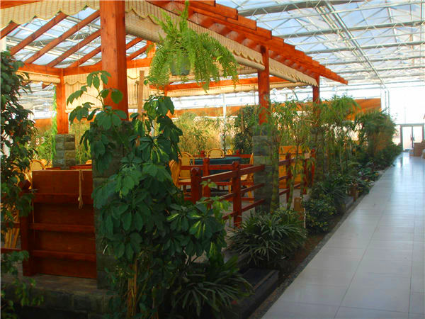 綠色生態餐廳完全按照標準溫室的結構建造,多采用文洛式,覆蓋材料多為PC板或者玻璃,結構保溫性能好,整齊規范,室內各個空間溫度均勻,有利于景觀植物的生長,鑒于餐飲布局的需要,在文洛溫室結構的基礎上,可進行局部調整。該溫室建造成本相對較低,溫室升降溫能耗低,節約后期運行費用。