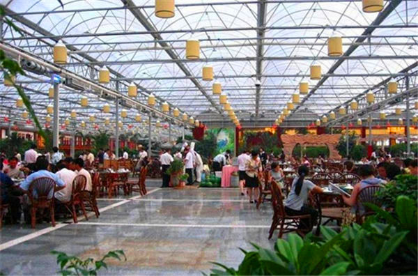 綠色生態餐廳完全按照標準溫室的結構建造,多采用文洛式,覆蓋材料多為PC板或者玻璃,結構保溫性能好,整齊規范,室內各個空間溫度均勻,有利于景觀植物的生長,鑒于餐飲布局的需要,在文洛溫室結構的基礎上,可進行局部調整。該溫室建造成本相對較低,溫室升降溫能耗低,節約后期運行費用。